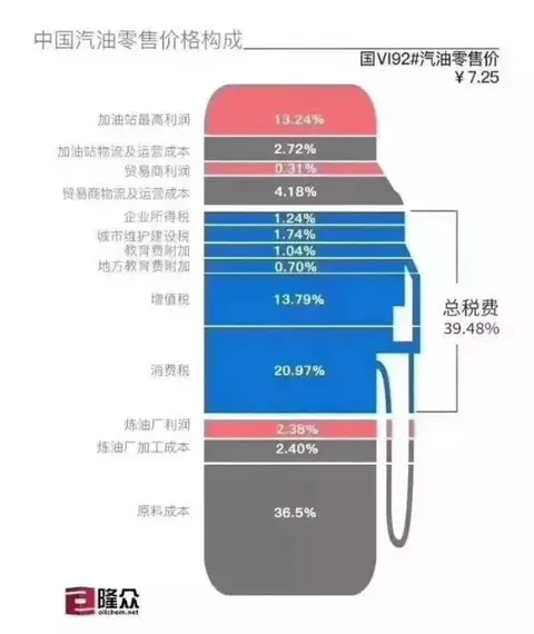 从此前隆众资讯所计算的汽油零售价格构成来看,主要分为原料成本、炼厂成本及利润、税费、物流成本、加油站利润等,其中原料成本占到36.5%。