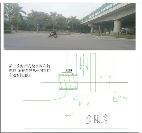 第三阶段 (2020年11月21日至2020年12月25日)封闭龙溪路由北向南右转车道,由北向南的车辆通过直行车道进入金瓯路右转。