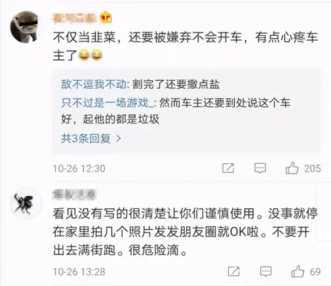 有网友表示,“我亲眼见过,有一次进地库,前车Model Y,一个轮子就这么歪着掉了……看得我这叫一个稀奇,第一次看见还能把车轱辘开掉的。”还有网友表示,“不仅当韭菜,还要被嫌弃不会开车,有点心疼车主了。”更有网友调侃到,“写得很清楚,让你们谨慎使用,没事就停在家里拍几个照片发发朋友圈就OK啦。不要开出去满街跑,很危险滴。”玩笑归玩笑,可是字字见血。