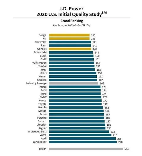 再看看jd power统计的每百台车故障数,特斯拉以250的故障数高居倒数第一。不仅远远高于平均水平166个,甚至让倒数第二的路虎以228的成绩都有些望尘莫及。