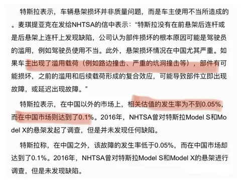 第二,悬架损坏情况在中国尤其严重。从特斯拉公布的数据来看,在中国地区销售的车辆出问题的概率达到0.1%,高过其他地区。那么,就想问一句,这难道不是特斯拉或者其他一些外资品牌自己需要反省的地方吗?作为产品的提供方,是不是应该立足于销售地区的国情、路况,进行专项的产品开发验证?以适应销售地区的国情、法规、路况、驾驶员习惯?笔者没去过美国,也不了解美国的路况。但就算美国人从来不上马路牙子,不走泥泞路,那进入中国市场,中国的用户是需要面对这些场景的,如果你不达标,是不是就得召回。