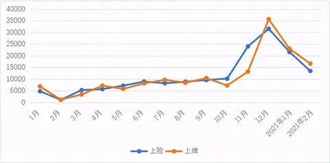 备注:这里采用的是上海市信息中心汽车产业研究室发布的数据,2021年2月上海总体上牌数是37878台,小客车是34147台,其中拍卖的12444台,差额为5068台,分配到沪C或者其他特殊用途。