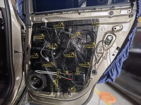 后门双层隔音:(使用大白鲨银鲨对门板进行双层隔音减振处理,抑制车门共振,阻隔噪音传递,创造良好的声场环境。)