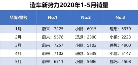 但是到了5月,情况发生了变化,蔚来继续以6711辆的成绩排名第一,小鹏汽车以5686辆排名第三,而第三的位置,则被4508辆的哪吒汽车占据。