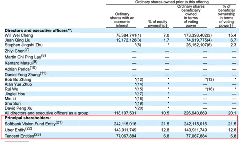 招股书显示,在主要股东方面,软银持股比例达21.5%,为滴滴最大股东;Uber持股比例为 12.8%、腾讯持股比例为6.8%。