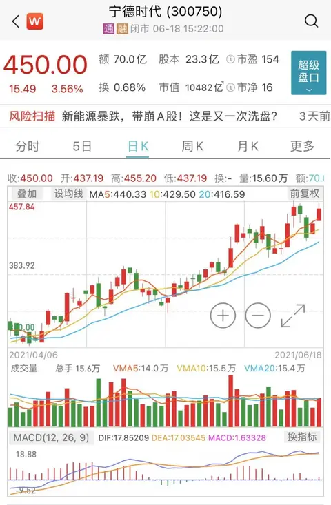 宁德股份的上市价格为25.14元,目前最新收盘价格为450元,总市值10482亿元,短短三年多时间,上涨了超16倍。