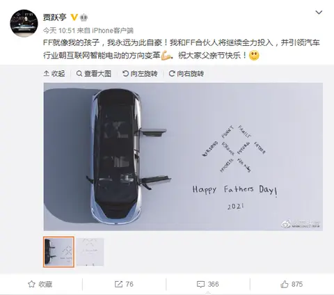 6月20日父亲节,贾跃亭在个人微博罕见发声,他写到:FF就像我的孩子,我永远为此自豪!我和FF合伙人将继续全力投入,并引领汽车行业朝互联网智能电动的方向变革。