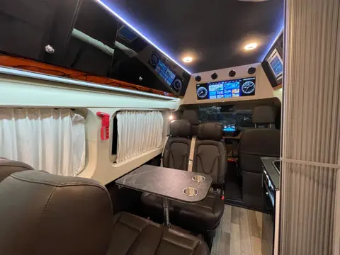 车内顶部采用了细纹布,地板采用游艇级防水耐磨地板革,置物组合柜采用的是环保双面亚克力亮光板,有质感且美观。整车经过隔音隔热降噪处理,窗户均进行了隐私保护,在车内可以拥有舒适的活动环境。
