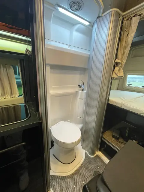 中置拓展式卫生间采用了隐藏式卷帘门设计,将卷帘门隔断手动拉动至关闭位,就可以形成一个独立的卫浴空间,区域内配置有粉碎性直排马桶、置物组合柜、毛巾架等多功能卫浴设备。水路方面,整车标配26L黑水箱、115L防冻内置清水箱、30L污水箱。