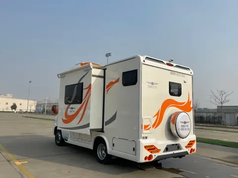 房车后区是厨房,后方车壁上开有侧窗,方便在做饭时通风散烟。料理台下面配有储物抽屉。配备带盖式水槽、141L进口双直流冰箱与电磁炉,微波炉,洗衣机等设施。