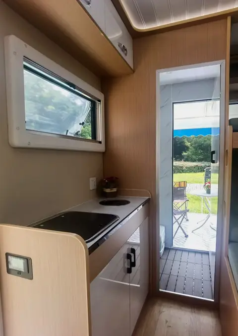 外观配色选用蓝色和白色,清新简约,充满英伦风格。车身外轮廓尺寸5300/5545 x 2315 x 2735mm,厢体尺寸为3850 x1730 x 2190mm,整备质量1680kg,最大总质量为1980kg。轻量化也是近年房车的一大趋势,这款车的质量并不算很重,排量2.0T左右的普通轿车或SUV都可以轻松牵引。