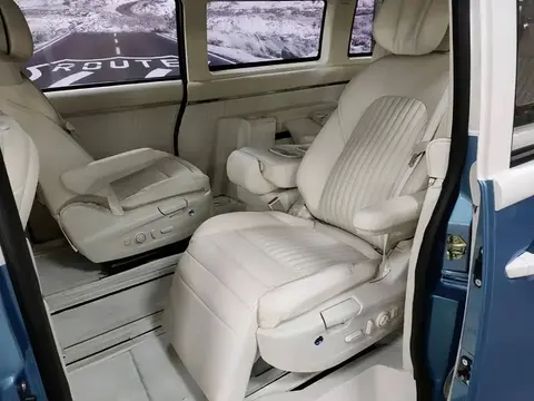 内饰同样采用复古风格,但并没有沿用那经典的奔驰车标形状的三幅式方向盘和经典的单仪表盘,换成了现代的多功能方向盘和液晶仪表盘,整个中控台设计有奔驰的既视感。内部布局可按客户要求6/7/8座定制,座椅采用标准的MPV专用航空椅,包含多向调节、记忆功能,并搭载腿托,甚至支持向后180度旋转功能。