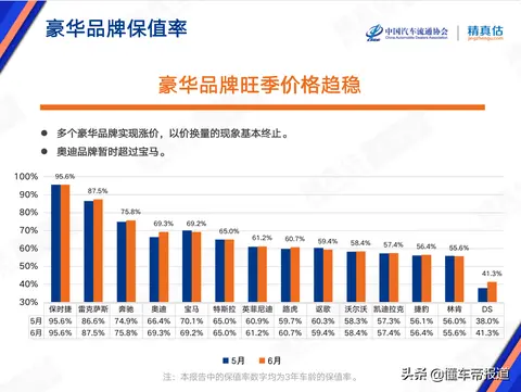 6月多数豪华品牌实现上涨,以价换量的现象基本终止。甚至刚刚“复活”的DS品牌保值率上涨了3.3%。保时捷再夺当月保值率“状元”头衔,三年保值率保持在95.6%的历史最高峰。雷克萨斯以87.5%排在第二,奔驰6月保值率也呈上升趋势,奥迪品牌本月表现超过宝马。