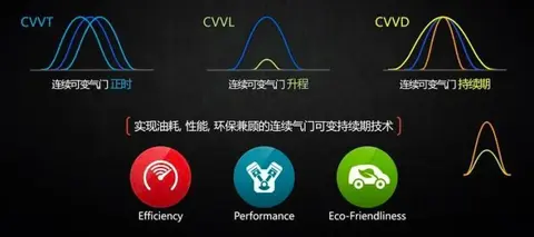 CVVD的全称为Continuously Variable Valve Duration,也就是连续可变气门持续期技术。聊它之前咱们就得先聊聊CVVL和CVVT,CVVL为连续可变气门升程技术,可改变气门的升程,以适应不同工况,而CVVT为连续可变气门正时技术,这是一项非常成熟且应用非常广泛的技术,可使气门工作时间段移动,适应不同工况。而CVVD则基本集成了CVVT+CCVL共同优势。