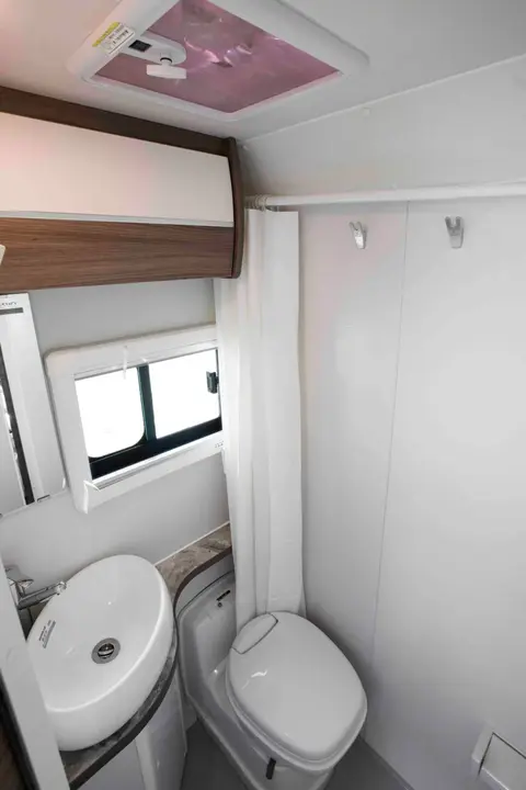 卫生间在车尾的另一侧,采用了比较常规的设计,整体式卫生间内配备有抽拉花洒、赛特福德盒式座便器、淋浴防水帘、挂钩、换气扇、储物柜等。