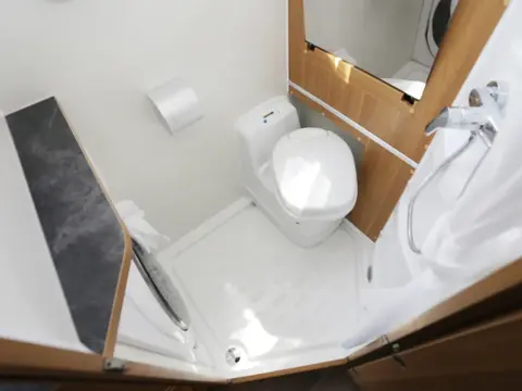 防水卫生间设计,内部配有翻折面盆、独立花洒、梳妆镜、置物架、抽拉式马桶等。为方便旅途中清洗衣物,在置物架的下面还内嵌有一台2.5kg韩国大宇洗衣机,可以选配更大容量或者带烘干功能的配置。