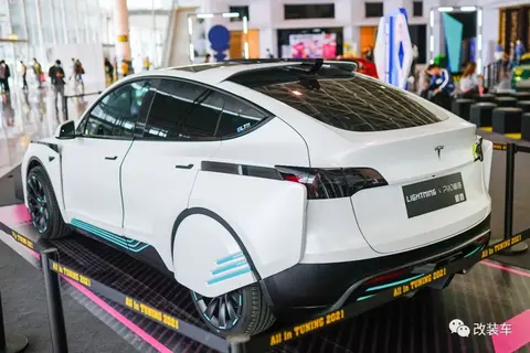 在现场还有重量级选手Model Y出现,全新打造的包围,给这款车带来了浓厚的未来感,有点像电影里的特技车型穿越到生活中来。