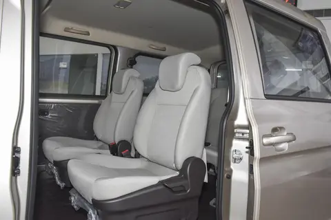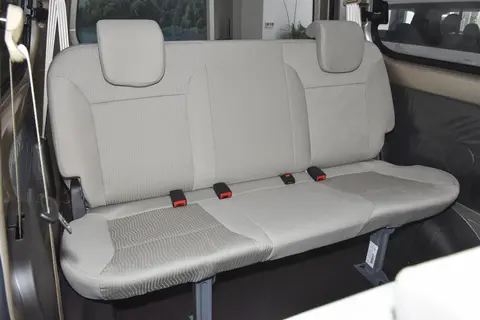 五菱宏光V的座椅采用灰色织物面料,坐感适中但坐垫较薄。这台五菱宏光V采用2+2+3的7座布局,就实际空间表现来看,身高177cm的体验者在前排将座椅调整合适后,头部余量两拳;此时来到第二排,头部空间保持两拳,腿部空间介于四指到两拳之间;而来到第三排,头部空间为一拳,腿部空间最小为四指。整体空间表现比较出色。