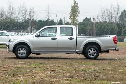 作为皮卡,整个车身分为前后两部分,前方车厢和后部的尾箱衔接在一起,十分美观,带有一定的实用性。车体整体长5523mm,宽1720mm,高1675mm,轴距3350mm,车体货箱长1820mm,宽1520mm,高1460mm,油箱容积70升。车窗周围加入了黑色的包边,造型方正。车门板下方还加入了凹陷设计,轮毂规格选择了215/75 R15,全尺寸的备胎规格。轮眉还做了突出的设计,看起来极具力量感,也让车身不至于太过单调。