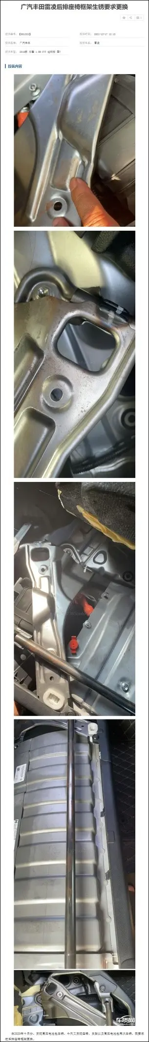 雷凌除了动力系统问题之外,还有车主投诉它出现车身生锈,生锈的地方包括发动机舱、车门、后排座椅框架等处。