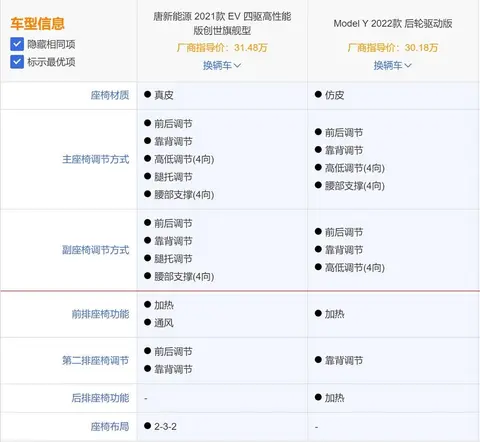 性价比对比方面,我们选择两款指导价比较接近的车型来进行对比,它们分别是:唐新能源2021款EV四驱高性能版创世旗舰型(指导价:31.48万)和特斯拉Model Y 2022款 后轮驱动版(指导价:30.184万)。