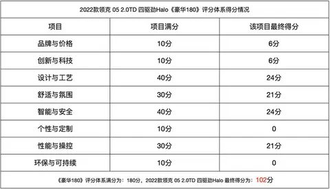 总结:最终领克05 2.0TD 四驱劲Halo在豪车事“豪华180”豪华评分体系的总分为:102分,属于入门豪华的标准。