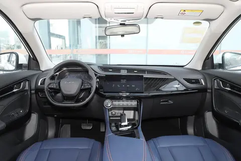 内饰上布局是主驾驶为主的座舱式,深色系色调为主,亮黑色和蓝色的配色搭配起来很稳重,不会感觉浮躁。配置上智能化含量有所提升,中控台上内嵌12.3英寸的液晶屏科技感满满,点亮屏幕后功能齐全,支持5G车联网及5G高速热点等新功能,堪比智能电车的配置享受。但塑料的方向盘握感对比轻奢的内饰有点儿廉价,座椅也是仿皮材质的,不过看价位也还算合格。