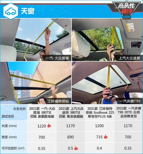 在针对天窗的测试中,四款车型均配备了可开启的全景天窗,不过开启面积有所不同。其中,上汽大众途昂天窗开启面积最大,达到了0.5m2,一汽-大众揽境和一汽奔腾T99开启面积同为0.35m2,后排通透性不如前排。采光面积方面,虽然一汽-大众揽境的天窗长度达到了1220mm,但宽度相对较窄,综合比较来看,还是江铃福特领裕的全景天窗采光面积更大。