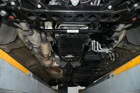 底盘两侧没有任何护板,所有部件都裸露在外。传动轴位于中央,排气管和其它管线分列两侧。排气隔热比较齐全,树脂喷涂也相对完整。