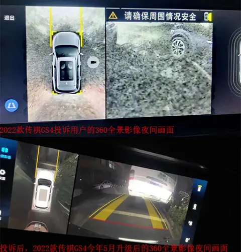 试驾的时候,2021款GS4的360全景影像非常清晰,可是2021年12月底提车时(白天),这位用户发现“我的车(2022款GS4智行科技)360全景影像有点不清晰,当时也没多想,几天后晚上停车时发现360全影在弱光时很难看清障碍物,用360全景看车左右两侧全是噪点雪花,完全看不清楚。”