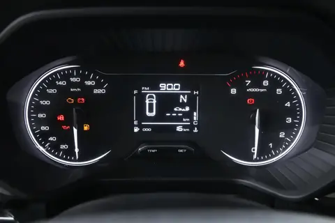 透过方向盘,能看到单色行车电脑显示屏,黑色背景配白色字体,清晰度较高,虽然不如彩色液晶仪表有科技感,但查看行车信息简单快捷,一目了然。