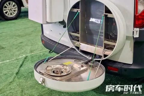 车辆尾部除了空调外机,还在类似备胎处巧妙地集成了外置柴油炉灶。