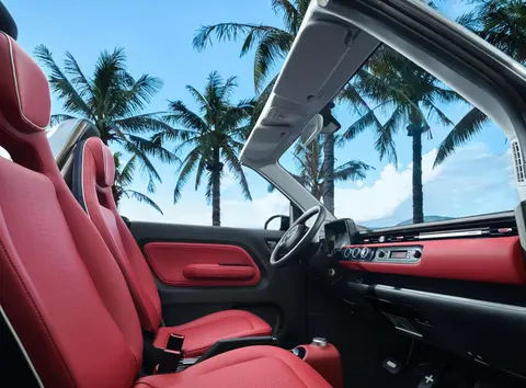 从官图来看,五菱宏光MINIEV敞篷版提供海天蓝、祖母绿、摩登黑三种车身颜色选择,外观依旧采用了我们熟悉的“方盒子”造型,采用了双色A柱设计以及无边框车门,后方还设计了防滚架,并提供红黑双色软顶篷布可选,官方称该车将配备创新半自动开关篷结构。