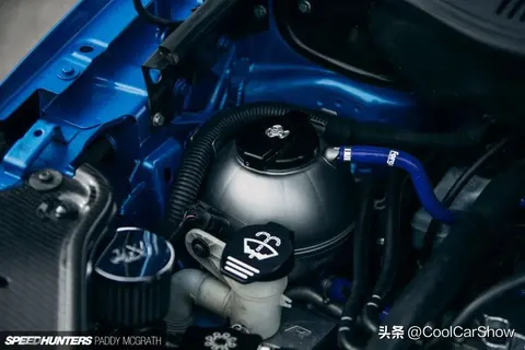 后排则全部拆空,取而代之的是蓝色clubsport防滚架、Air Lift Performance的气动储气罐和气泵,井然有序布置在地台上;中央位置则是碳纤维头盔的摆放格。除了碳纤维之外,部分整个内饰用Alcantara重新包裹,并搭配蓝线缝制,这难道不是大众运动部门的作品?