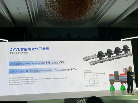 通过DVVL智能可变气门升程技术,在高升程状态下增加进气量,提升发动机瞬时响应性,2000rpm响应时间提升28%。低速小负荷工况下,使用低升程控制代替节气门控制,降低泵气损失,从而减少油耗。最终使动力性提升3%的同时,燃油经济性提升5%。