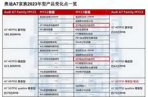 据相关文件显示,2023款奥迪A7(图片|配置|询价)将全系减配降价,新车全系取消矩阵式LED大灯、LED后尾灯带动态转向灯、动画效果三项配置,同时2.0T两款车型还减配了本应在2023年型款增加的电动方向盘调节功能。据了解,2023款奥迪A7此前官方指导价为59-79万元,部分配置减少后,全系车型指导价下调1.94万台,官方指导价为57-77万元。