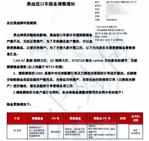 此前,有2022款奥迪A7车主称,奥迪A7从5月开始就已经减配了后尾灯动态效果,只保留矩阵LED大灯和后尾灯动态转向灯,而如今这两项配置又将全部被取消,原因也是“受全球零部件供应链影响”。