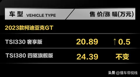 与2023款柯迪亚克类似,2023款柯迪亚克GT针对入门版TSI330奢享版售价调整,相比2022款上涨0.5万元。2023款顶配TSI四驱旗舰版售价不变。