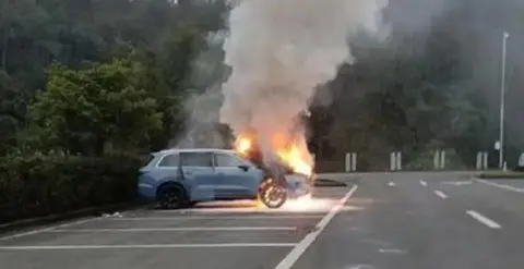 事发现场的视频显示,该车停在路边,车身完全被大火覆盖。