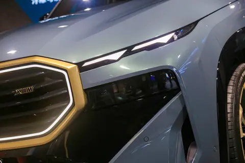 Xm的分体式大灯、巨型双肾格栅都是宝马最新的家族式设计,实车气场十足。金色的双肾格栅内藏一圈发光灯带,隐形黑色辐条上带有金色的XM车型标识,透过格栅可以看到面积硕大的中冷,为V8机器提供必要的冷却。从正前方看去,XM的威严感十足,肌肉感也很强。