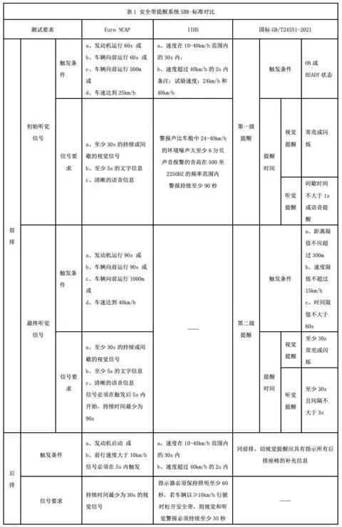 当前国内外安全带提醒系统的标准对比如下表所示: