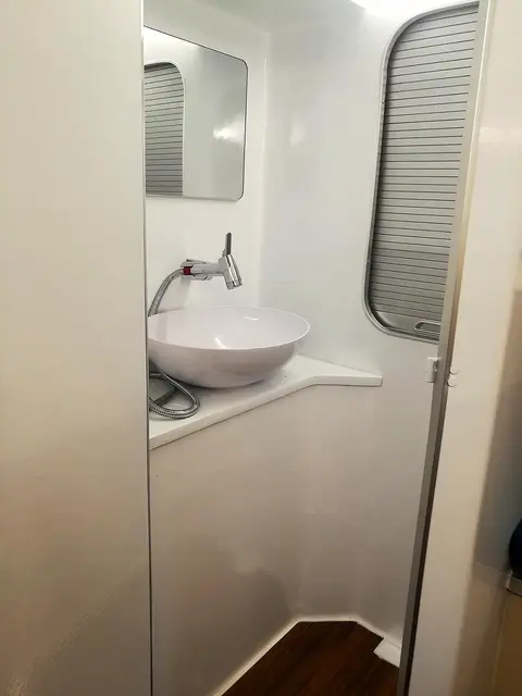 厨房对面是卫浴区,内部包括折叠一体式水盆+龙头淋浴(可满足临时淋浴需求)、浴室镜、便携式马桶;水盆旁边留出的空间可以放置一些卫浴用品。
