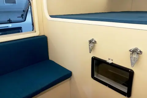 房箱中部的会客区实际空间体验并不压抑,采用横向两排对卡座沙发布局形式,中间设置有折叠桌,收起后便于室内活动,展开后可满足室内用餐、办公及娱乐等需求。同时,卡座拼床后尺寸达到1640×860(mm),作为增加的睡卧区,能应付临时的需求。另外,房车天窗(×2)及两侧车窗可以满足采光和通风换气效果。