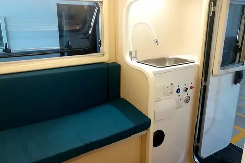 厨房和卫生间位于房箱尾部两侧,一进车内右侧作为厨房区,整体造型设计简洁实用,橱柜尺寸相对紧凑,台面留出的水槽配合燃气炉仍能满足满足2-3人的房车旅行。
