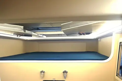 前排额头床尺寸为1800×1600(mm),周围内壁表面平整,光滑,顶部则是复杂的升顶机构,周围LED日光灯带效果拉满,夜晚还可作为照明使用。