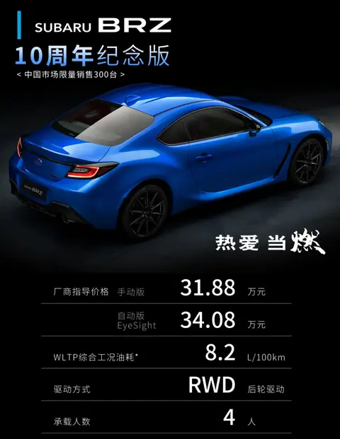 近日,为了纪念斯巴鲁BRZ(图片|配置|询价)诞生10周年,斯巴鲁官方以2022车型为基础,打造出了斯巴鲁BRZ 10周年纪念版车型。新车限量发售300辆,提供2款配置车型,售价31.88-34.08万元。