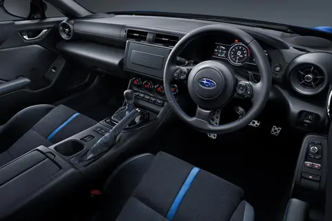 后车窗10周年纪念标识、档把防尘套(蓝色缝线)&高触感真皮制动手柄(蓝色缝线)、18英寸铝合金轮毂(哑光黑)、电动折叠后视镜(黑色)、门内饰板10周年纪念标识、BRZ车尾铭牌(黑色)、真皮搭配奥司维®Ultrasuede®面料座椅(蓝色缝线)、高触感真皮方向盘(蓝色缝线)、 运动/雪地模式(黑色按键)(自动版EyeSight车型配备) 、TRACK模式(黑色按键)、 左右双区域独立自动空调系统(暗色金属装饰)、 智能钥匙系统带一键式点火启动(暗色金属装饰)。