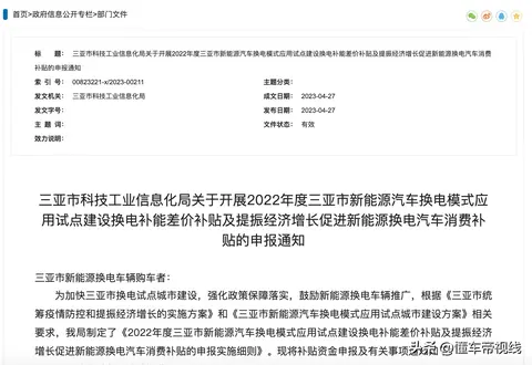 [懂车帝原创 行业] 海南省三亚市科技工业信息化局日前发布通知,开展2022年度三亚市新能源汽车换电模式应用试点建设换电补能差价补贴,以及促进新能源换电汽车消费补贴的申报。