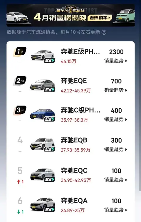 中大型轿车EQE售价47.8-53.43万元,燃油版E级售价44.01-56.95万元(EQE的终端优惠力度比燃油版E级大得多,实际成交价更低)。EQE的4月销量为700辆,1-4月销量2140辆,很难被消费者认可。
