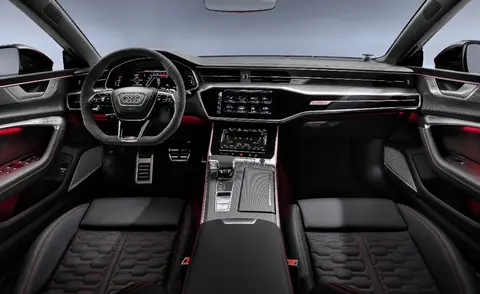 内饰方面,奥迪RS 7也采用了全新的设计,整体风格更偏向数字化和科技化。仪表转速表使用L设计,中控屏也采用了两块全新的触摸式液晶屏,并新增了疲劳驾驶提示、360全景影像、无线充电、触摸式阅读灯以及车载香氛等配置。